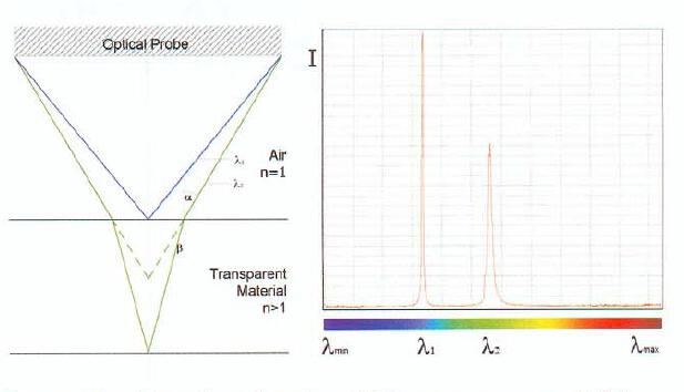 该系统主要由光谱仪、光源和光学探头组成;光源通过多模光纤进入光学探头,光学探头将不同波长的光聚焦到透镜上不同距离处形成色散,同时在透镜上下表面不同波长的光形成自垂直产生反射光谱信号进入光学探头传输进入光谱仪获得不同波长的离焦量;然后通过软件算法计算得到透镜的中心厚度。