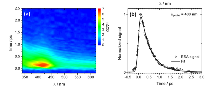 图 5: (a) Waterfall plot of TAS spectra of Ade[-H] in D2O excited with a 266 nm pump laser as a function of delay time, and (b) normalized decay kinetics at 400nm.[2]