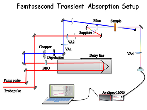 当一个分子吸收一个光子时,它将能量赋予该分子,使其暂时从基态激发到更高的电子能级或振动能级。由于能量守恒定律,只有当光子能量正好等于基态和激发态的差时,光子才能被吸收,且分子的数量和被吸收光子的数量有直接的关系,进而可直接确定分子的密度。因此,吸收是常用的光谱技术之一,特别是在浓度测量方面。由吸收引起的激发态寿命大多数都非常短暂,通常为飞秒或皮秒量级,但亚稳定激发态除外。基于这一事实,1950年,乔治·波特和罗纳德·诺里什在剑桥大学时意识到他们可以使用闪光灯通过一种称为闪光光解的方法来研究分子间的能量转换[1]。直到超快锁模激光器的发明,科学家们才得以充分利用波特和诺里什的贡献,他们两人因为这一发现获得了1967年的诺贝尔化学奖。今天,超快激光器已经取代了闪光灯成为这些类型的实验选择的激发光源,这种技术更常被称为瞬态吸收光谱法(TAS)。