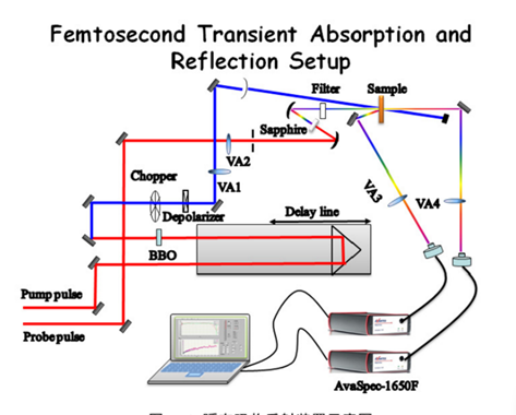 AvaSpec-ULS2048CL-EVO光谱仪在超快应用测试中可采用单通道或双通道两种方式。单通道方式是使用一台光谱仪预先测试存储未放置样品时宽带白光的光作为参考,随后使用该光谱仪测试白光经过样品后的吸收光谱。双通道方式是采用两台光谱仪,一台光谱仪测试白光经过样品的光谱,另外一台光谱仪实时测试宽带白光的光源作为参考,避免光源不稳定对结果的影响,两台光谱仪可通过归一化消除台间差,通过同步线保证响应同步。此外,因为光谱仪的灵活性,研究者可根据自己的实验需求设计光谱仪的测试方式,以下两图为原吉林大学隋来志博士设计的测试光路。