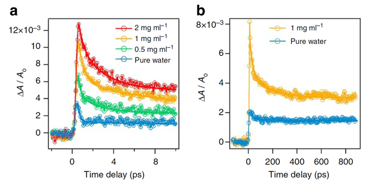图 6: TAS spectra of CNCbl in water, ethanol, and a 1:1 mixture of water and ethanol. Excited with a 266 nm pump laser [3]. 氧化石墨烯的光还原 由马克斯·普朗克研究所(the Max Planck Institute),汉堡大学(University of Hamburg),约阿尼纳大学(University of Ioannina)和多伦多大学(University of Toronto)组成的联合小组使用瞬态吸收光谱技术更好地解释了氧化石墨烯的光还原过程[4]。在这项研究中,他们通过瞬态吸收光谱观察了两个重叠的衰减,一个发生在2 ps以下,另外一个发生在2 ps至250 ps之间,最终表明光还原过程是一个多步骤过程。快速衰减与氧化石墨烯离子化和产生水的溶剂化电子相关,然后溶剂化电子与氧化石墨烯相互作用导致在缓慢衰变期间引起还原。 图7中所示的数据是使用Avantes光纤耦合光谱仪收集的,并使用266 nm泵浦激光激发。