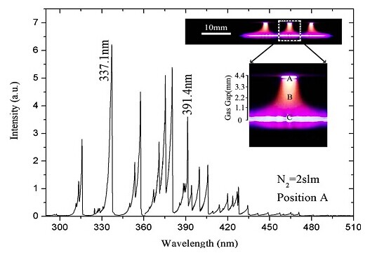 等离子体发射光谱研究是了解放电条件下气体状态的有效手段和用于无干扰诊断等离子体状态参数的方法。它为研究不同实验参数下的等离子体行为提供了一种很好的方法。通过采集射频磁控溅射过程中等离子体发射光谱,可以计算出电子密度和电子温度,并且能够分析溅射功率、工作压强等实验参数对等离子体状态的影响。荷兰Avantes公司的AvaSpec-ULS2048高分辨率、多通道光纤光谱仪,波长范围200-1100nm,光谱分辨率(FWHM)0.1nm。下图是氮分子(N2)的发射光谱数据。