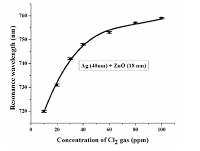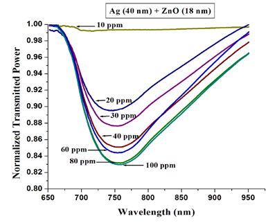 现在,将SPR传感器集成到光纤探头中,可以在危险环境中部署目标传感器。这些探头通常是通过剥去一部分光纤的包层,然后在该部分上涂敷一层金属膜层,然后再涂敷一层介电膜层来生产的。位于德里的印度理工学院的一个小组最近发表了使用此类型探头的研究结果,他们在光纤芯上先镀一层银,然后再镀一层氧化锌用来检测氯气[1]。在他们的实验中,他们把Avantes公司的AvaLight-HAL卤钨灯发出的宽谱光耦合到探头中。当氯气分子与氧化锌相互作用时,会导致生成氯化锌,改变相对介电常数,从而改变表面等离子体的波长。由于一小部分光可以在光纤的包层内传播,因此导致透过光谱发生变化,他们使用了Avantes公司的AvaSpec-ULS3648-USB2光纤光谱仪进行了测量。下图1显示了测得的光谱随氯气浓度的变化,检测范围为10ppm至100ppm。