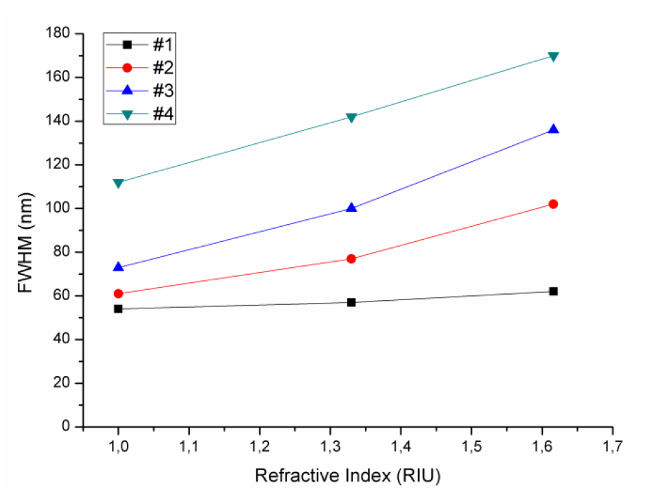 图2:四种不同厚度的溅射法金纳米颗粒膜的FWHM值与环境折射率的函数。[2]
