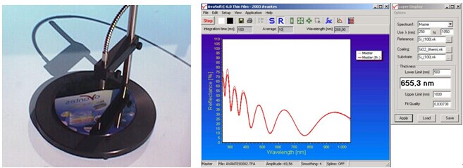 薄膜测量系统是基于白光干涉的原理来确定光学薄膜的厚度。白光干涉图样通过数学函数被计算出薄膜厚度。对于单层膜来说,如果已知薄膜介质的n和k值就可以计算出它的物理厚度。 AvaSoft-Thinfilm应用软件内包含有一个大部分常用材料和膜层n和k值的内置数据库。 AvaSoft-Thinfilm系统可以测量的膜层厚度从10 nm到50 um,分辨率可达1 nm。 薄膜测量应用于半导体晶片生产工业,此时需要监控等离子刻蚀和沉积加工过程。还可以用于其它需要测量在金属和玻璃基底上镀制透明膜层的领域。其他领域中,金属表面的透明涂层和玻璃衬底也需要严格测量。 AvaSoft-Thinfilm应用软件能够实时监控膜层厚度,并且可以与其他AvaSoft应用软件如XLS输出到Excel软件和过程监控软件一起使用。 薄膜测量的典型装置如图所示。